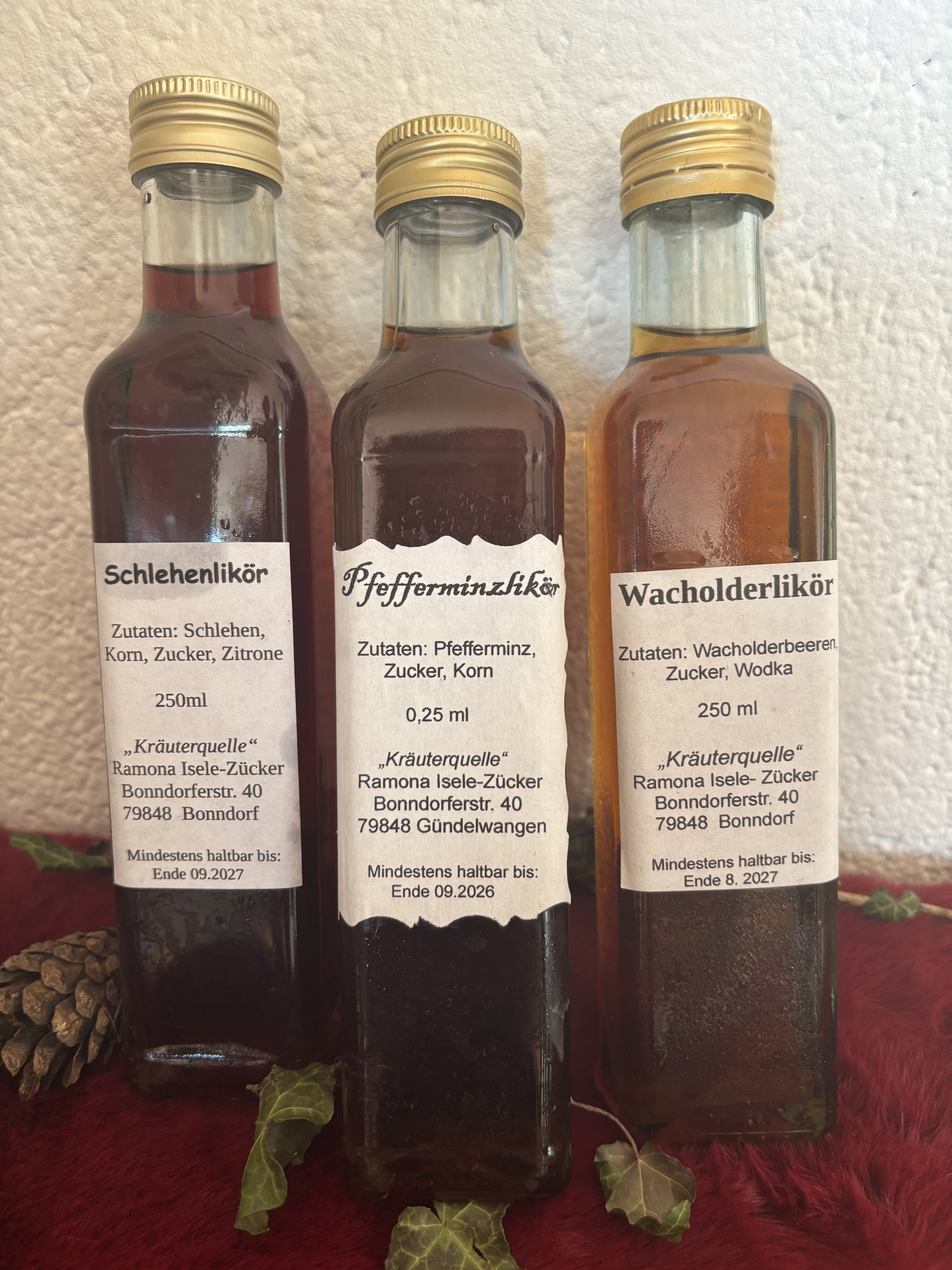 Oxymel Apfelessig: stoffwechselanregend Honig: entzündungshemmend Hagebutten: Vitamin C Oregano: krampflösend Quittensirup Weitere Sorten: Hagebutte Holunderbeeren Holunderblüte Mädesüß Mirabelle Rhabarber Rose Veilchen Waldmeister Wiesensalbei Liköre Weitere Liköre: Tannenlikör Schafgarbenlikör